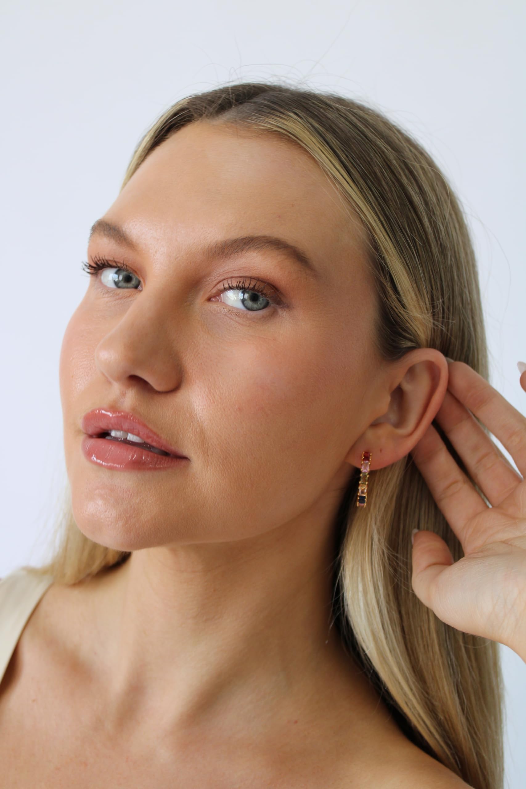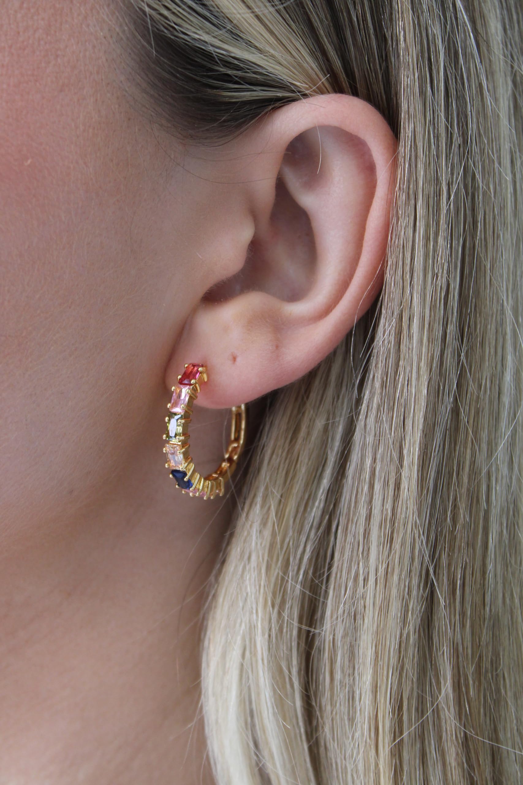 Add a splash of happiness to your jewelry with these colorful hoop earrings. Featuring a sleek 18K gold-plated finish and vibrant multicolored stones, these dainty hoops bring playful elegance to any outfit. Perfect for everyday wear or special occasions, their lightweight design and secure clasp ensure all-day comfort. Whether you’re headed to brunch or dancing into the night, these rainbow hoops add the perfect pop of color and personality to your look.