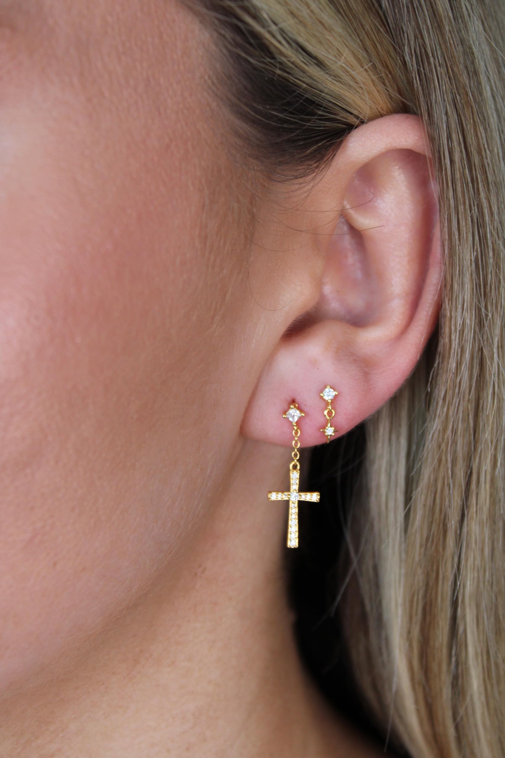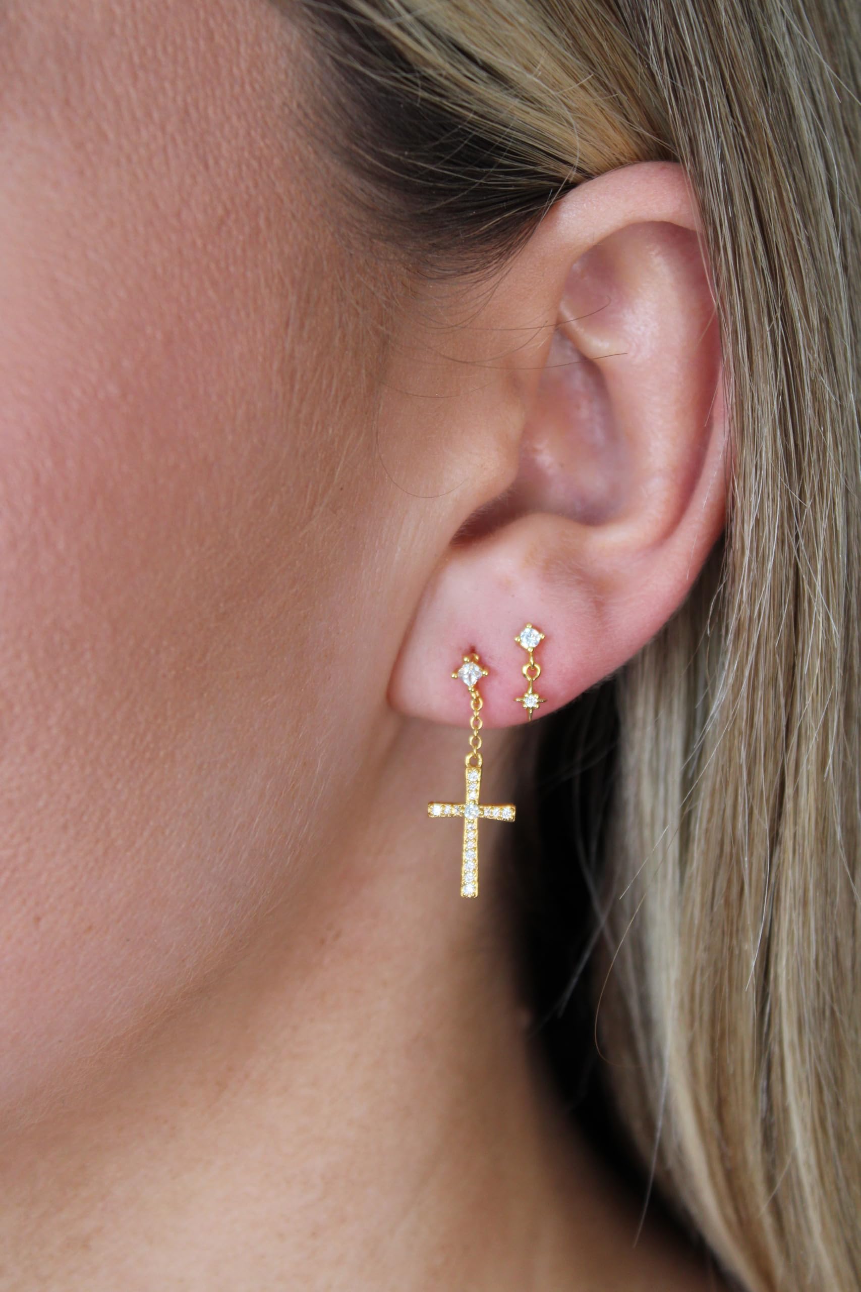 The Knightly Mismatched Cross Earrings feature two distinct cross designs with sparkling white cubic zirconia, crafted in 18K gold-plated brass for comfortable, hypoallergenic everyday wear.