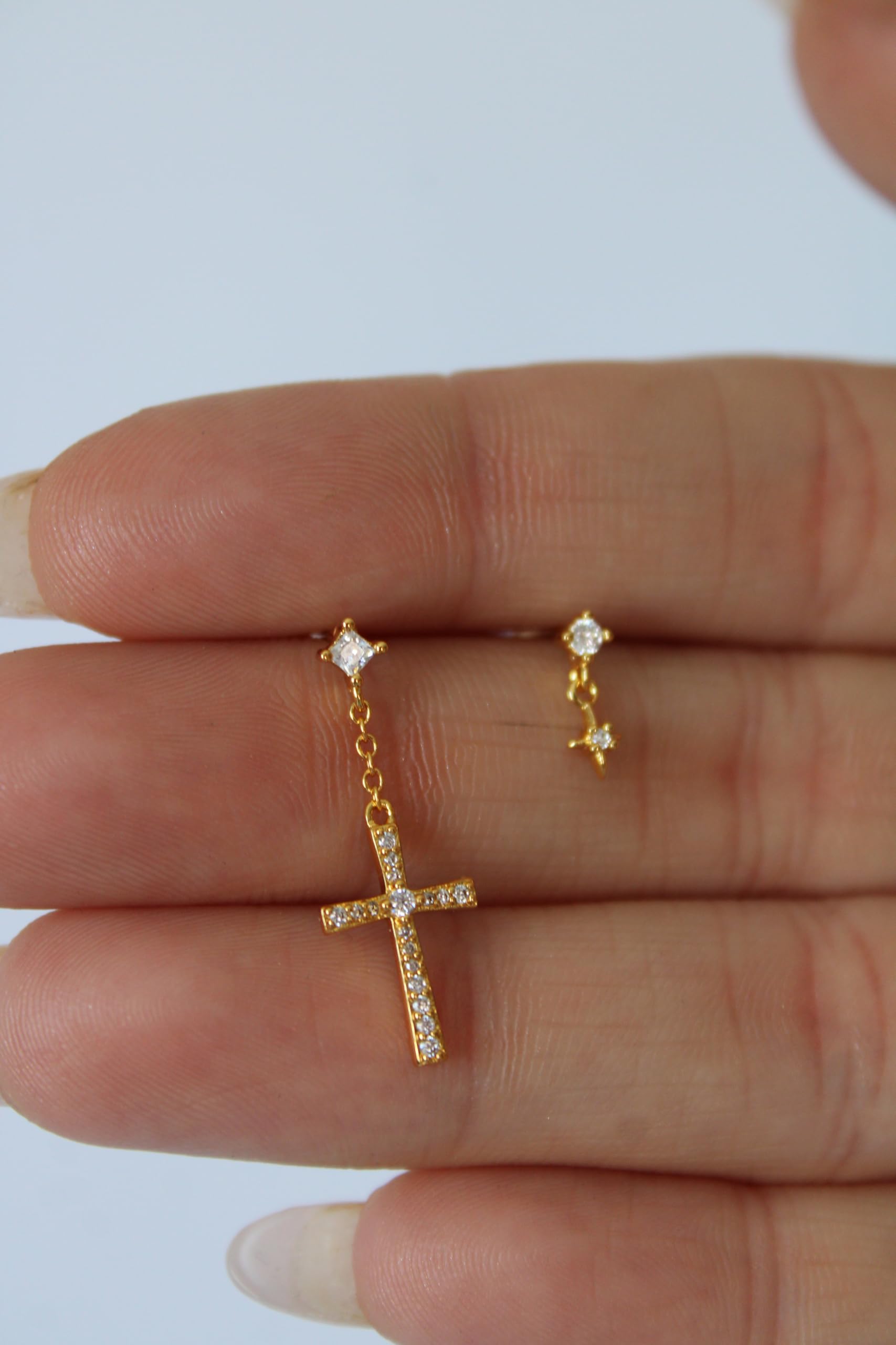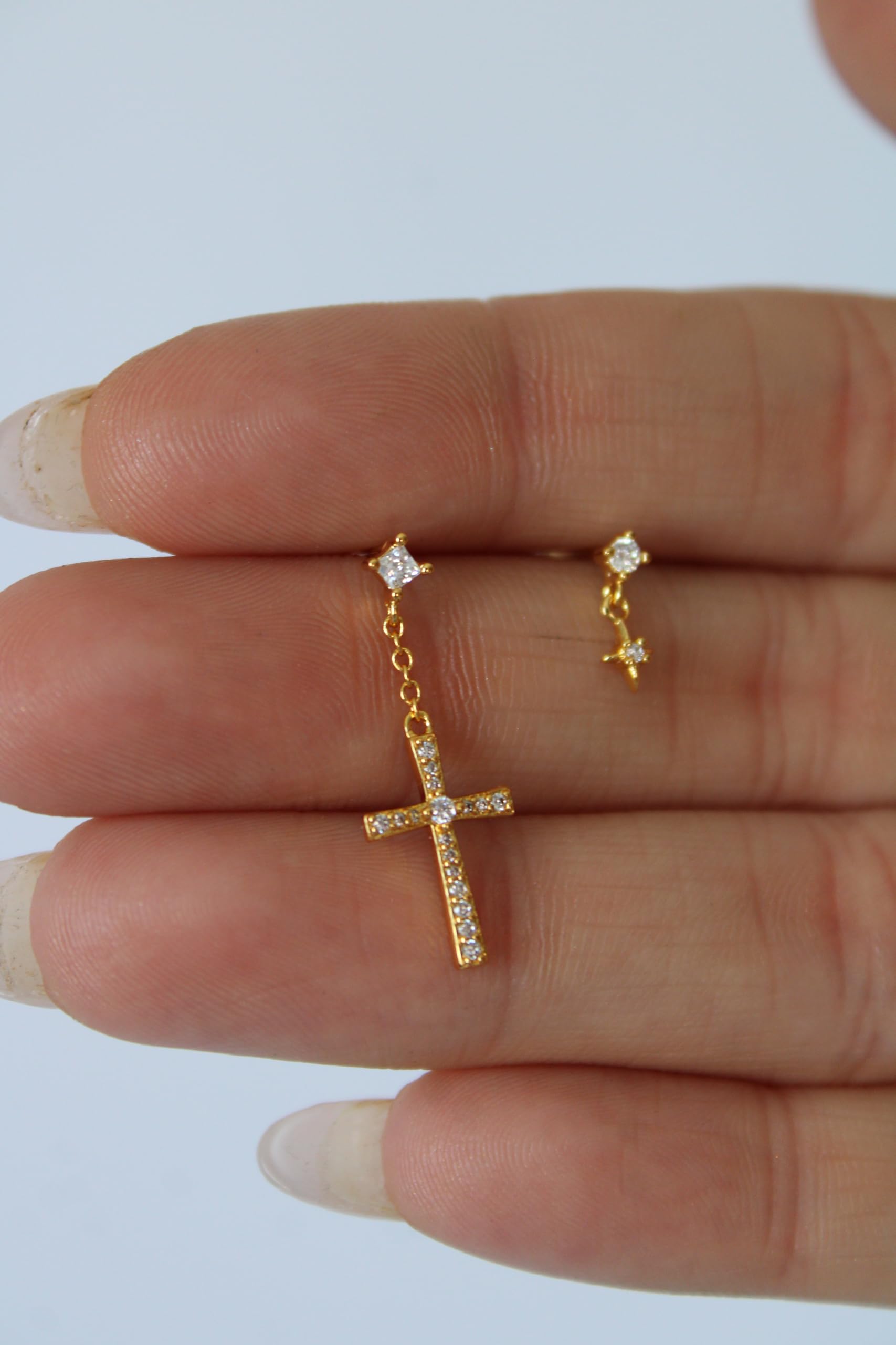 mismatched cross earrings gold plated asymmetrical zircon hypoallergenic dainty studs non tarnish women’s jewelry gift