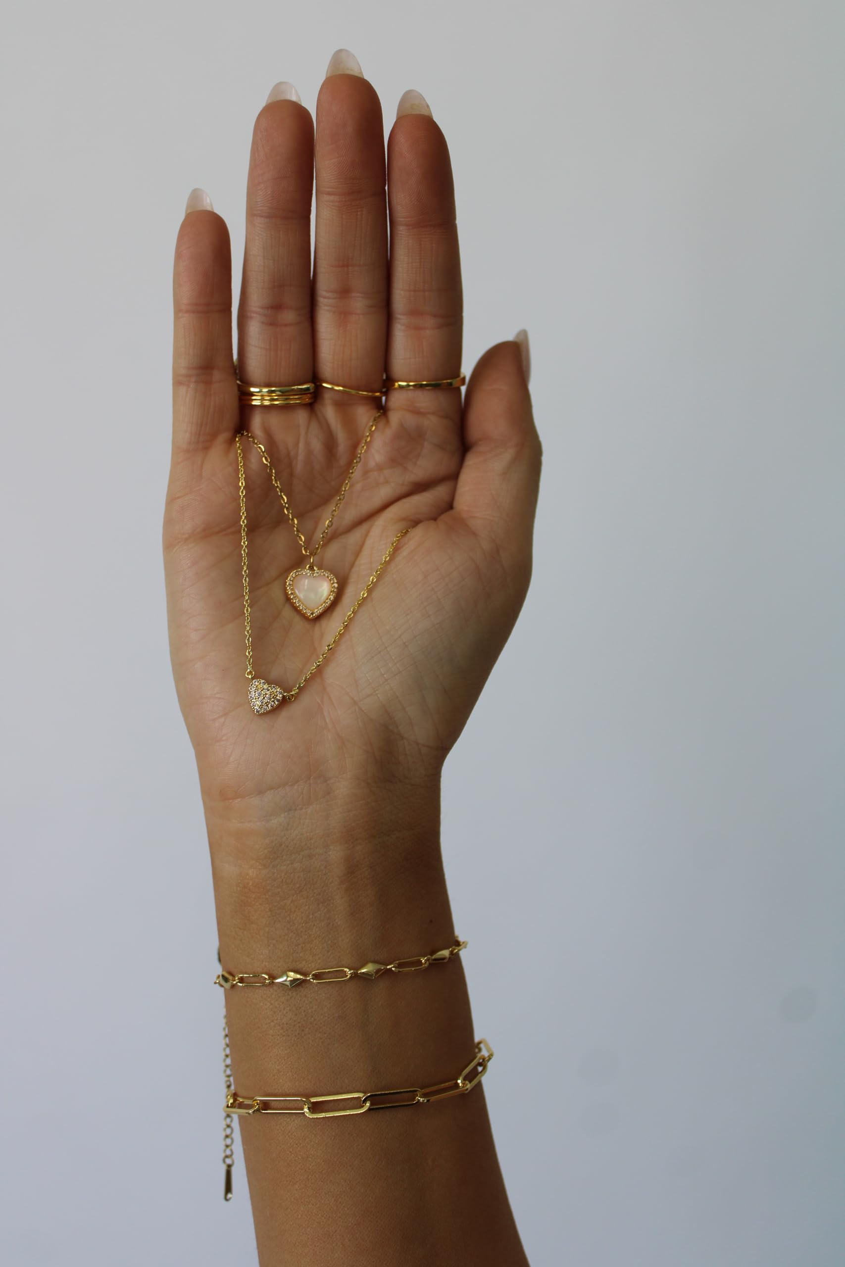 The Pink Opal Heart Pendant Necklace by Malibu Sunday captures feminine elegance in a delicate design. Featuring a soft pink opal stone set within a dainty heart-shaped gold-plated pendant, this necklace offers a gentle shimmer that effortlessly complements any look. Lightweight and versatile, it transitions beautifully from casual days to special evenings. Whether gifted to someone you love or added to your own collection, this romantic piece blends modern simplicity with heartfelt meaning—perfect for everyday wear or cherished moments.