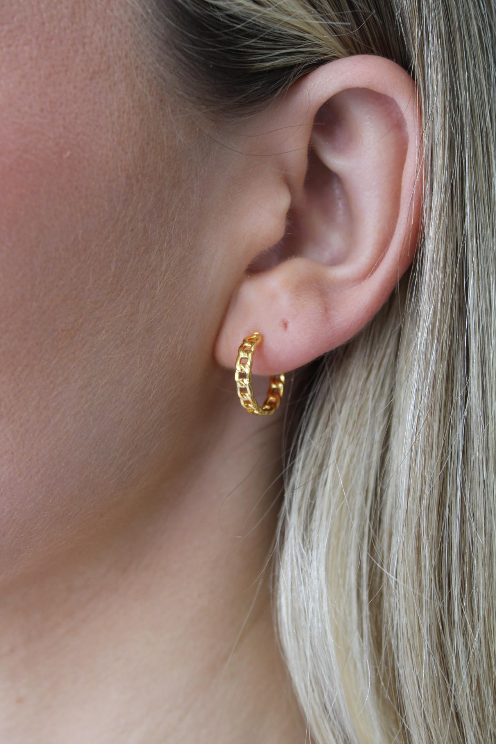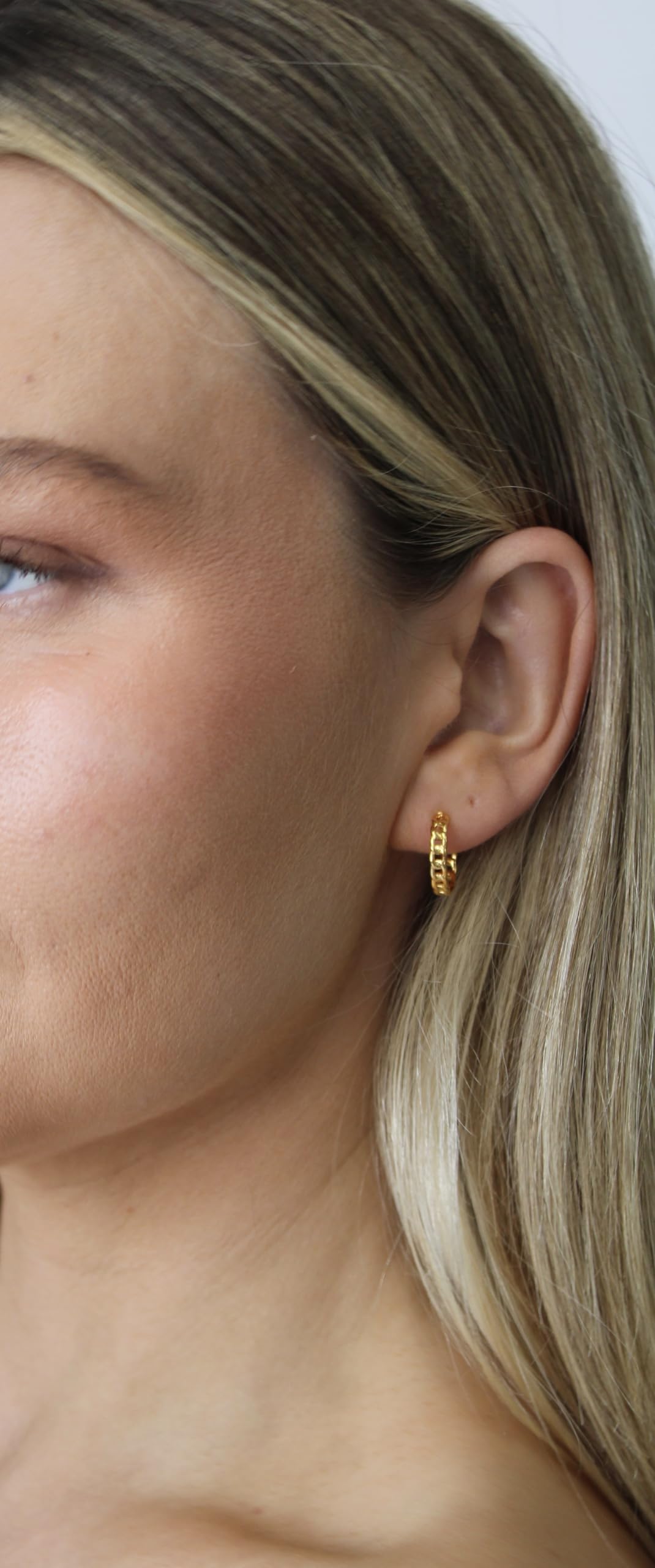 The Shaylee Chain Hoop Earrings bring bold texture and modern elegance to your everyday style with a radiant 18K gold-plated finish and eye-catching chunky chain detail.