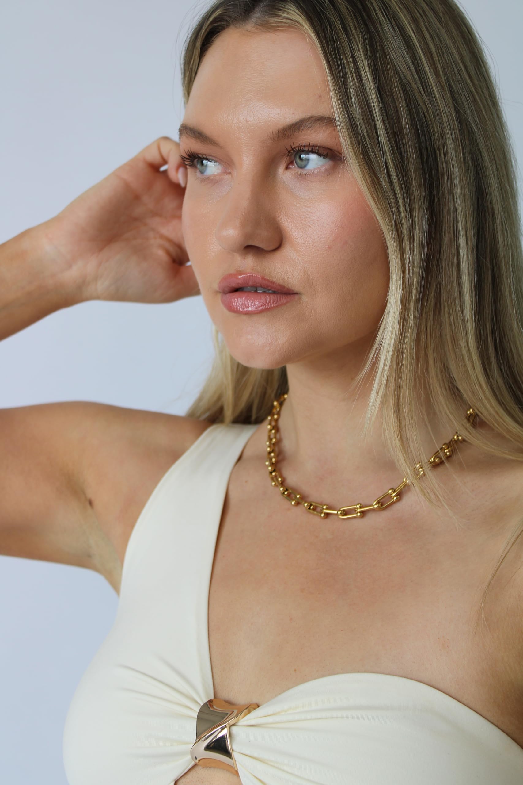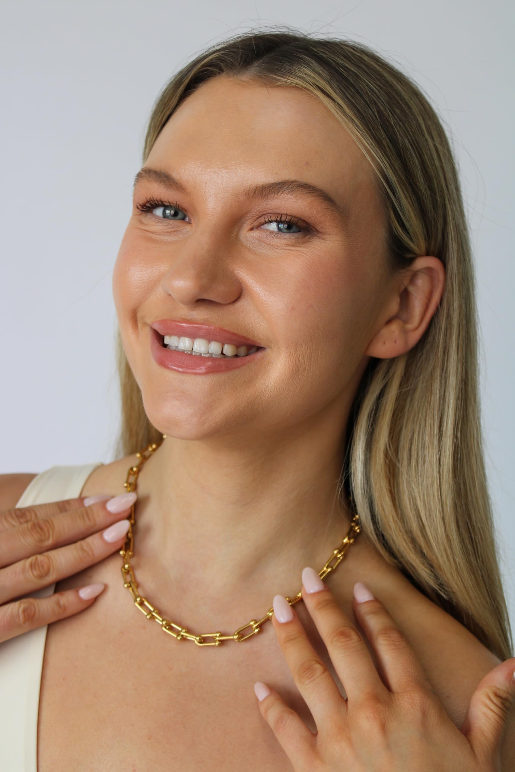 This 2-piece set includes a bold paperclip chain necklace and matching bracelet—crafted in high-shine 18K gold plating for instant edge and everyday glam.