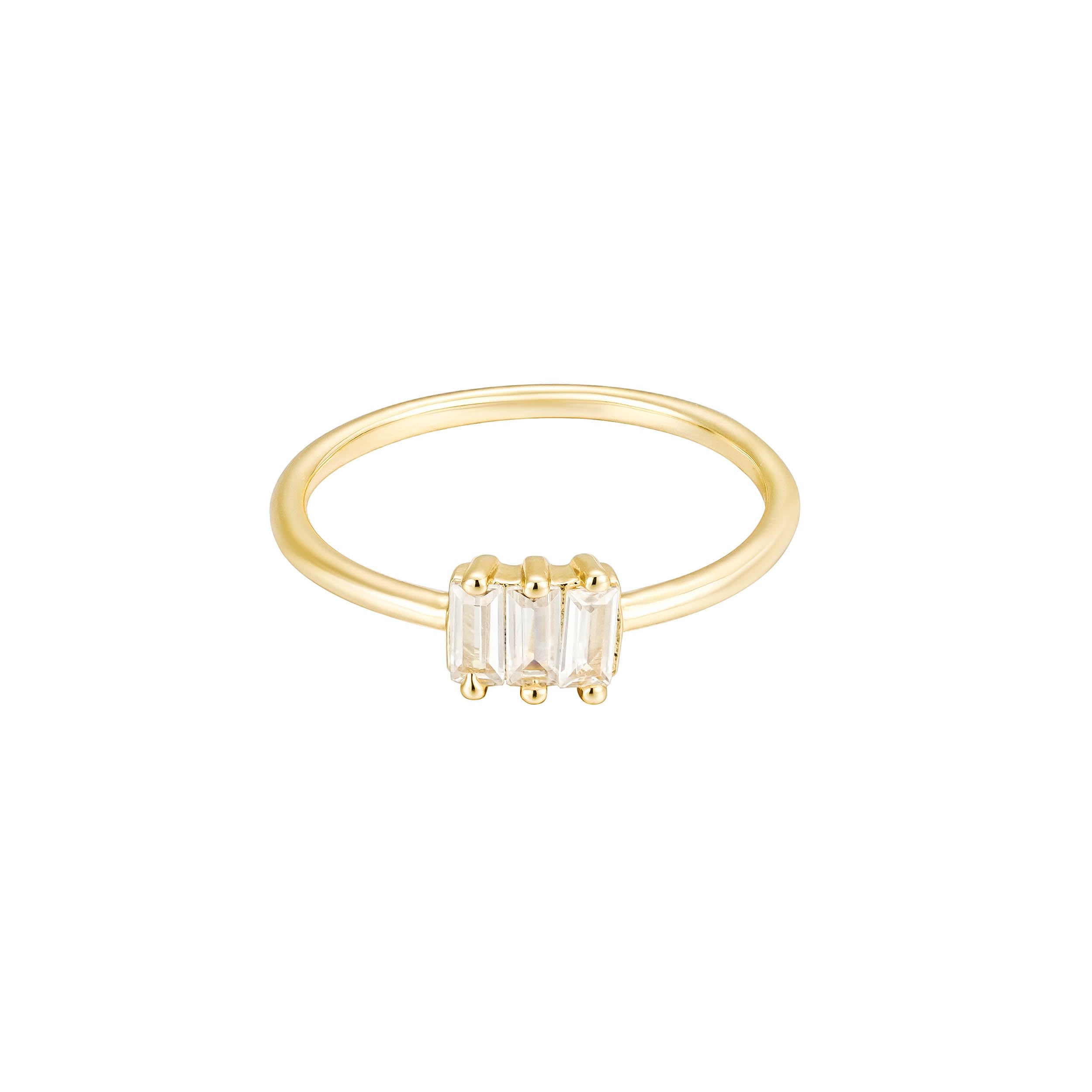 This dainty gold ring features three baguette-cut cubic zirconia stones set in a sleek 18K gold-plated band—perfect for stacking or wearing solo with effortless elegance.
